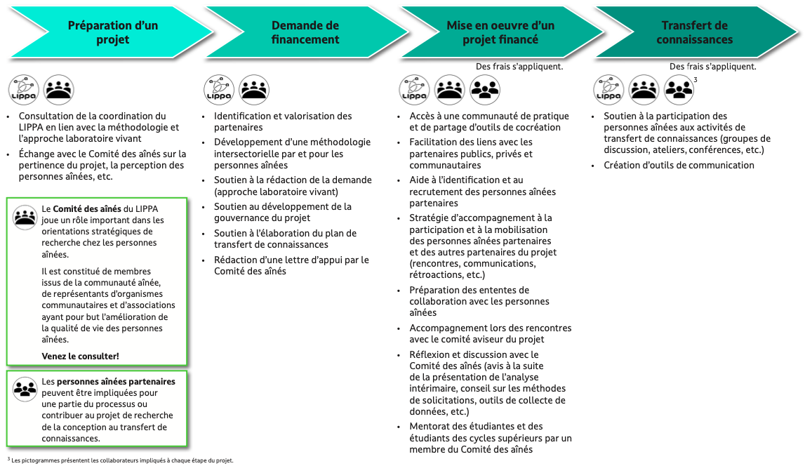 Le LIPPA offre du soutien aux équipes de recherche pour la conception et la mise en œuvre de projets intersectoriels privilégiant une approche de laboratoire vivant. Entre autres, il facilite les liens entre le milieu communautaire, la population et la communauté scientifique afin de répondre aux besoins réels de la population aînée en Estrie. Il accompagne les équipes de recherche afin d’assurer l’intégration des citoyens aînés tout au long du processus.