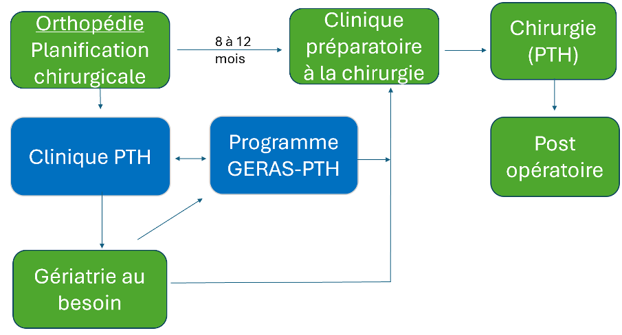 - Les gestionnaires des départements impliqués dans les soins aux patients avec PTH élective (pré et postopératoire) et organisatrice communautaire du CIUSSS de l’Estrie – CHUS.